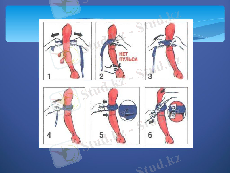 8. Резеңке жгут қою орнына қан кету аймағынан жоғары салфетка немесе сүлгімен ораңыз.