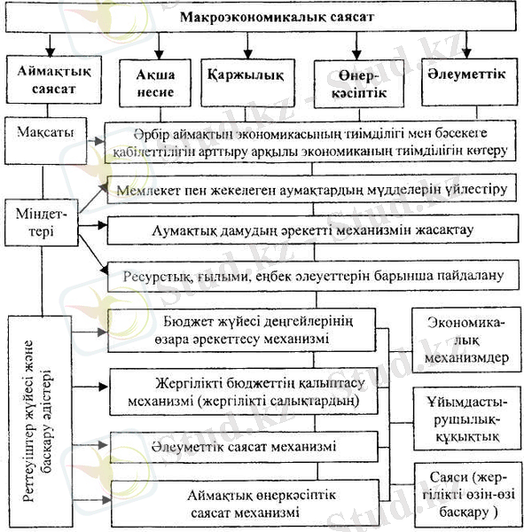 Аймақтық саясаттың мәні мен міндеттері және оларды жүзеге асырудың өзіндік механизмдері бар (1-сурет) . Макроэкономикалық саясаттың құрамдас бөлігі бола отырып, аймақтық саясат әрбір аймақтың экономикасының тиімділігі мен бәсекеге қабілеттілігін арттыру арқылы экономиканың тиімділігін көтеруді өзінің басты мақсаты етіп қояды. Қойылған мақсатқа жету үшін, әрине, міндеттердің қойылуы шарт. Олардың қатарына: мемлекет пен жекелеген аумақтардың мүдделерін үйлестіру, аумақтық дамудың әрекетті механизмін жасақтау, сонымен қатар аймақтың ресурстық, ғылыми, еңбек әлеуетін барынша пайдалану жатады. Осы суреттен көрініп тұрғанындай, аймақтық саясаттың мақсаты, міндеттері мен жүзеге асыру әдістері мемлекеттік реттеудің басқа бағыттарымен өзара тығыз байланыста жүзеге асырылады.