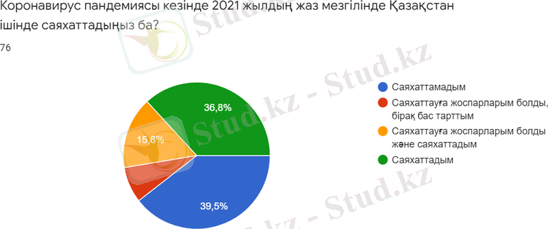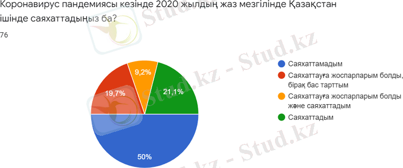 Коронавирус пандемиясы өршіген сәтте мемлекет локдаун режимін жариялап, қатаң карантиндік шараларды орнатты. Үкімет тұрғандарға адамдар көп шоғырланған аймақтарға бармауға кеңес берді. Сауалнаманың бірінші сұрағының нәтижелеріне сәйкес, 2020 жылдың жаз мезгілінде Қазақстан төңірегінде саяхаттаған отандастарымыздың саны одан алдыңғы жылдың статистикасымен салыстырғанда саяхаттаушы туристтердің саны күрт азайды. Негізгі трендке сай басым көпшілік Қазақстандықтар(69, 7%) саяхаттаған жоқ, ал қалғаны(30, 3%) төніп тұрған қатерге қарамастан саяхаттады. Нақтырақ санды мәліметке сүйенсек, респонденттердің 50%-ы саяхаттамауды шешіпті, ал қалған 19, 7%-ы саяхаттауларын егжей тегжейлі жоспарлауына қарамастан ойларынан бас тартыпты. Келесі ретте, 9, 2% респондент саяхаттауға жоспарлар құрып, шын мәнінде ұстанғанын және 21, 1% адам саяхаттағаны жайлы хабарайды. Бұдан шығатыны, расында да Қазақстан аумағындағы саяхаттаушылар саны азаюы, туризм саласындағы дағдарысқа әкеліп соғуы мүмкін.