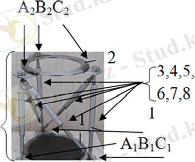 SHOLKOR 9 платформалық манипуляторы 1 платформасының жоғарғы жағынан және 2 платформасының төменгі жағынан тұрады [7] . 10 Мачта платформалық манипулятордың 1-нің жоғарғы жылжымалы бөлігіне қатаң бекітілген. Плавтформалық манипулятордың төменгі бөлігі негізге (діңгегіне) қатаң бекітіледі. Жоғарғы платформа 1 және төменгі платформа 2 өзара алты қозғалмалы актуаторлармен 3-8 А 1 , В 1 , С 1 , А 2 , В 2 , С 2 байланыс нүктелері арқылы байлнысады. Актуаторлар бір-бірімен сфералық байланыс немесе жаңа патенттелген кабельдік байланыс арқылы қосылған. Бұндай байланыс тәсілдері платформалық манипулятордың жоғарғы бөлігіне кеңістікте еркін орын алмастыруға мүмкіндік береді. Белгілі сызықтық генераторларды актуаторлармен параллель қосып, жұмыс органынан электр энергиясын өндіруге болады.