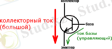 Эмиттер мен коллектор арасында күшті ток (коллектор тогы), ал эмиттер мен негіз арасында әлсіз басқару тогы (базалық ток) бар. Коллектор тогы базалық токтың өзгеруіне байланысты өзгереді. Неліктен?