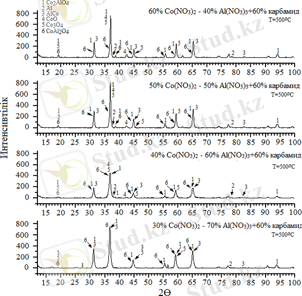 Сурет 11 - Бастапқы қоспаны алдын ала 500°C-та қыздырғандағы Co(NO 3 ) 2 - Al(NO 3 ) 3 /карбамид + H 2 O жүйесінің рентген спектрлері
