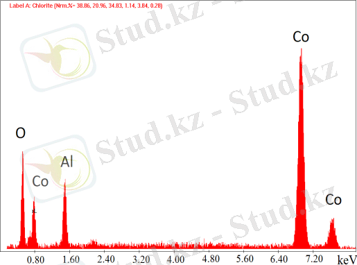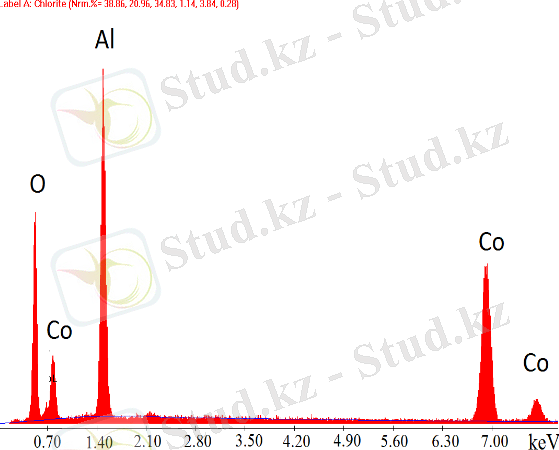 Негізінен, бастапқы қоспада алдын-ала 500°C дейін қыздырылған пеште синтезделіп алынған құрамында 30% және 60% Co(ΝΟ 3 ) 2 бар катализаторлар зерттелді, 16 - 17 - суреттер . Наноөлшемді бөлшектер SCS әдісімен дайындалған катализаторларда анықталды. Сондай-ақ, катализатордың құрамын анықтау үшін EDS талдауы жүргізілді. Зерттеудің нәтижесінде келесі қосылыстардың бар екендігі анықталды: CO 2 O 4 , Co 2 AlO 4 (кубтық), Co x Al y (кубтық), Co 3 O 4 , Al и СоО (кубтық) .