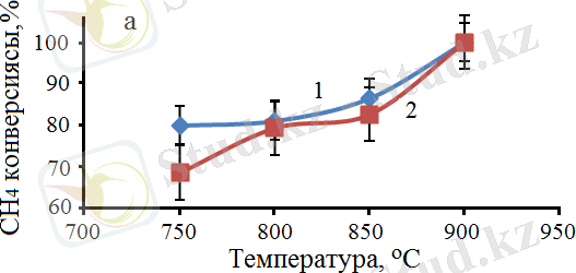 Ерітіндіде жану әдісімен синтезделген катализаторлар, метанның көміртегі диоксидімен көмірқышқылды конверсиялану үрдісінде 750-ден 900°С аралығында сынақтан өткізілді. Зерттеу нәтижелерінің барысында алынған CH 4 және CO 2 конверсияларының мәндері, сондай-ақ реакция өнімдеріндегі H 2 /CO қатынасы үшін белсенділік көрсеткен катализаторлардан 60% Co - 40% Al және 30% Co - 70% Al алынған мәліметтер 18-суретте келтірілген.