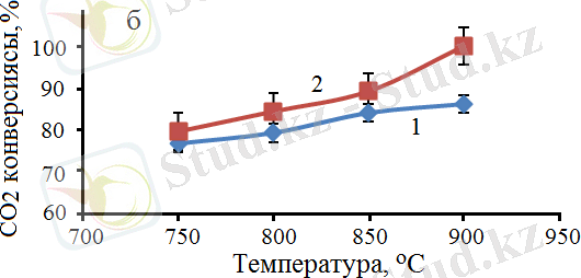 Белгіленулері: а: 1 - СН 4 конверсиясы, 2 - СО 2 конверсиясы, 3 - Н 2 /СО қатынасы; б: 1 - Н 2 шығымы, 2 - СО шығымы; W = 3300 сағ -1 .