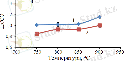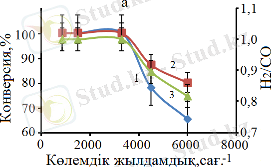 Метанның көмірқышқылды конверсиясы үрдісінде көлемдік жылдамдықтың әсері CO 2 конверсиясына қарағанда CH 4 конверсиясы үшін маңызды, 19 а - сурет . Бұл реакцияда метан сутегі алудың негізгі көзі болғандықтан, алынатын өнімдегі H 2 /CО қатынасы көлемдік жылдамдықтың жоғарылауымен төмендейді, 19 б - сурет . Бұл құбылысты CH 4 молекулаларының мөлшері (3, 99 Å) CO 2 (2, 3 Å) молекулаларының мөлшерімен салыстырғанда шамамен екі есе көп болатындығымен түсіндіруге болады. Сондықтан CH 4 молекулаларының адсорбциялануы мен десорбциялануының жүруі көлемдік жылдамдықты жоғарылатқан сайын реакцияның жүру жағдайында CO 2 молекулаларына қарағанда анағұрлым шектеулі екендігімен түсіндіріледі.
