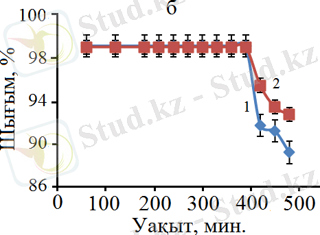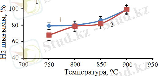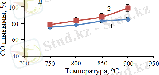 Белгіленулері: 1 - H 2 шығым, 2 - CO шығым, W = 3300 сағ -1 .