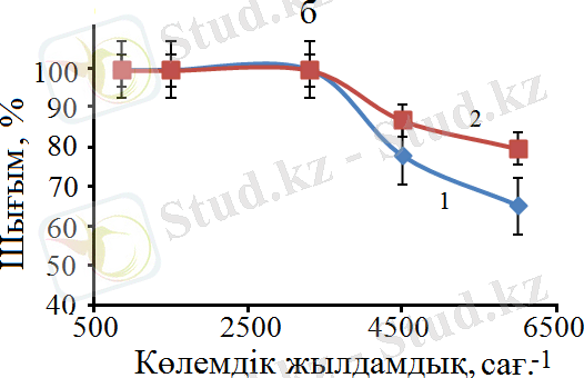 Сурет 22 - Реакциялық қоспаға су буы қосылған кезде өнімдердің шығымы (а) мен селективтілігінің (б) температураға тәуелділігі
