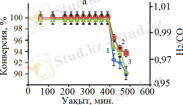 Тәжірибені жүргізу барысында жоғары катализдік белсенділік көрсеткен (19-суретте) катализатордың (бастапқы құрамы 30% Co - 70% Al) тұрақтылығы W = 3300 сағ -1 кезінде катализатордың тұрақтылығы зерттелді, 20-сурет. Аталған катализатор 7 сағат аралығында жоғары катализдік белсенділікке ие: CH 4 конверсиясы 90%, ал CO 2 конверсиясы 94%, 20а-сурет , H 2 шығымы 89% және CО шығымы 93%, 20б-сурет және H 2 /CO қатынасы 1 болғанын айтуға болады, 20а-сурет .
