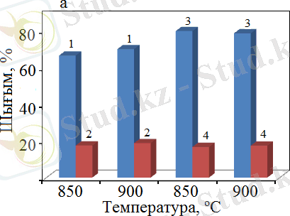Метанның көмірқышқылды конверсиялануында 850 және 900°C температурада ерітіндіде жану және ылғал сыйымдылығы бойынша сіңдіру әдістерімен дайындалған 30% Co - 70% Al катализаторларының белсенділігі зерттелді. Осы катализаторларда 3300 сағ -1 көлемдік жылдамдығында алынған өнімдерінің H 2 және CO шығымының нәтижелері 21-суретте көрсетілген.