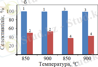 Белгіленулері: су буының қатысынсыз алынған 1 - H 2 , 2 - CO шығымдары; су буының қатысында алынған 3- H 2 , 4 - CO селективтіліктері.