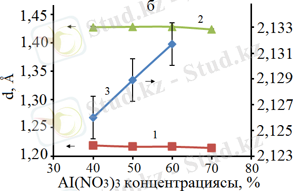Дайындалған катализаторлардың кристаллиттерінің орташа мөлшері РФТ нәтижесінде алынған шыңдарының ені бойынша есептелінді. 15-суретте келтірілген нәтижелерден бөлшектердің орташа мөлшері Al(ΝΟ 3 ) 3 концентрациясының жоғарылауымен төмендейтінін көрсетеді.