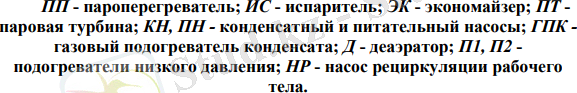 БГҚ - нің бұл түрі ең қарапайым жылу тізбегіне ие, ол бу турбиналық қондырғының (БТҚ) негізгі конденсатын жылыту схемасымен ерекшеленуі мүмкін. БТҚ жылу тізбегінде конденсатты жылыту болмауы мүмкін (сурет. 1, б) немесе жылыту конденсаттың газ жылытқышында болуы мүмкін (сурет. 1, А) немесе екі төмен қысымды жылытқышта деаэратор болған кезде (сурет. 1, в) [2] .