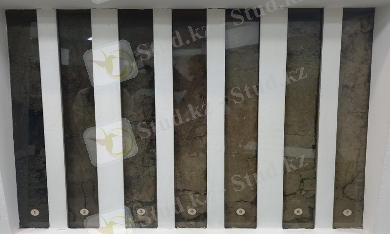 1. күлгін қара топырақ; 2. әдеттегі қара топырақ; 3. кәдімгі қара топырақ; 4. оңтүстік қара топырағы; 5. күңгірт сары топырақ; 6. ашық сары топырақ; 7. сорлар және сортаң. (Сурет Өскенмен қаласында орналасқан «Облыстық тарихи- өлкетану мұражайы»-нан түсірілген)