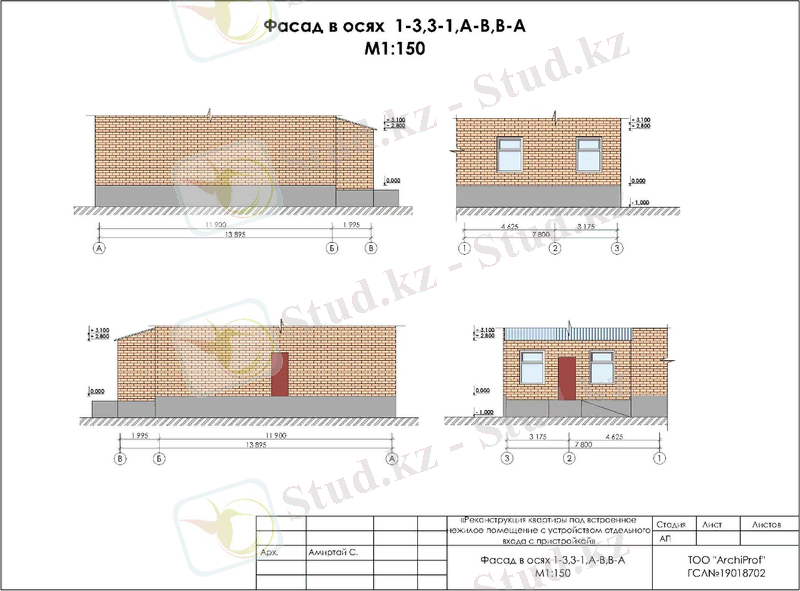 Сәулет жобаларын орындауға қатысу. ArchiCad программасын зерттеу, сызбаларды орындау. Объектіні пайдалануға беру актісі