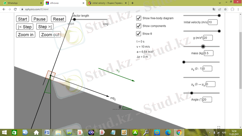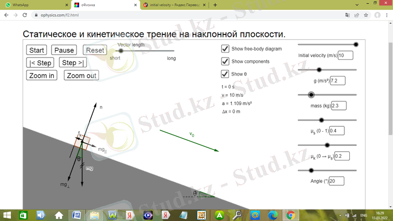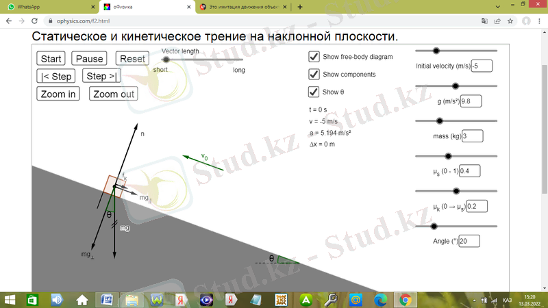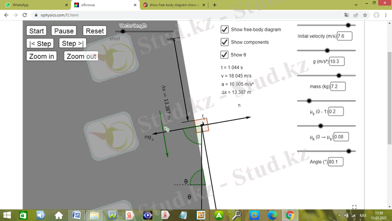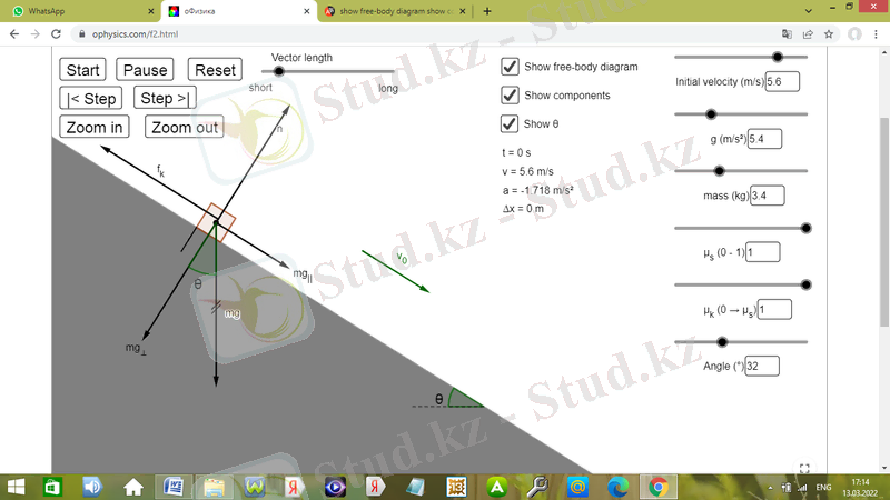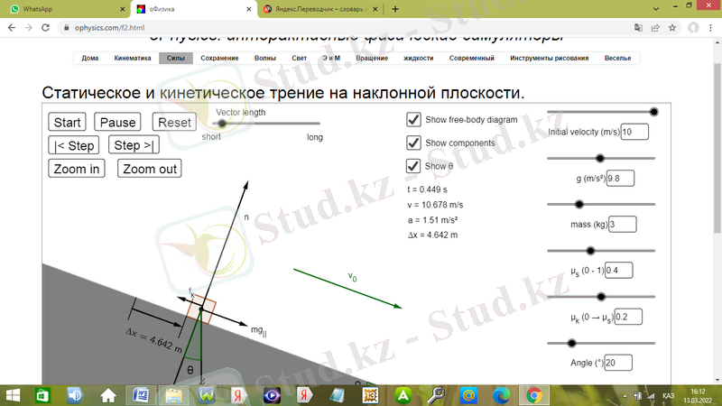 4-суретте статикалық және кинетикалық үйкеліп қозғалған денеге әсер ететін басқа да физикалық шамалардың бағытын көрсететін сызықтарды көрсету батырмалары орналасқан. Show free-body diagram - физикалық шамалардың бағытын көрсететін сызықтардың көрсету немесе көрсетпеу, Show components - компоненттерді көрсету немесе көрсетпеу, Show Ө - бұрыш, t - уақыт, v - жылдамдық, a - үдеу, Δx - қашықтық.
