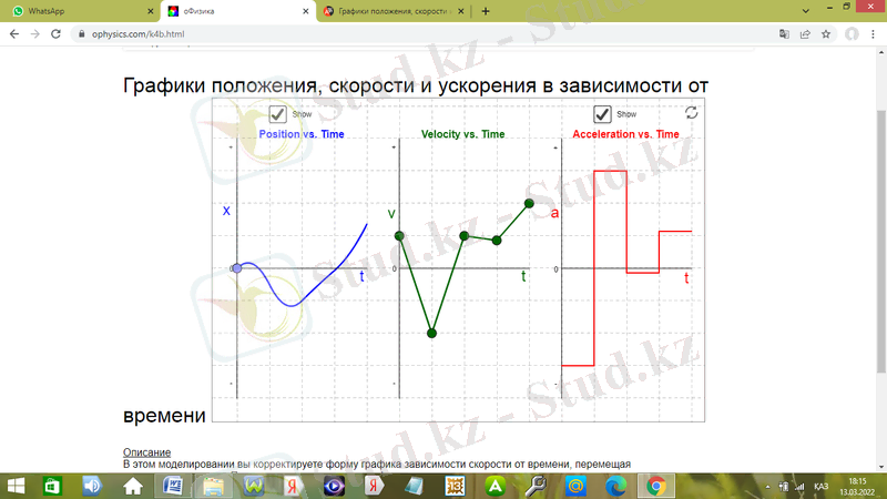 Тағы бір мысал ретінде уақытқа байланысты үдеу мен жылдамдықтың өзгерісін график түрінде GeoGebra-ға салып көрейік.