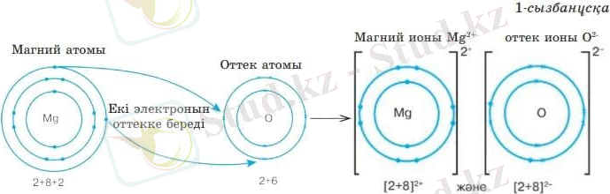 Реакция нәтижесінде магнийдің әрбір атомы екі электронын жоғалтады және әрбір оттек атомы осы екі электронды қосып алады.