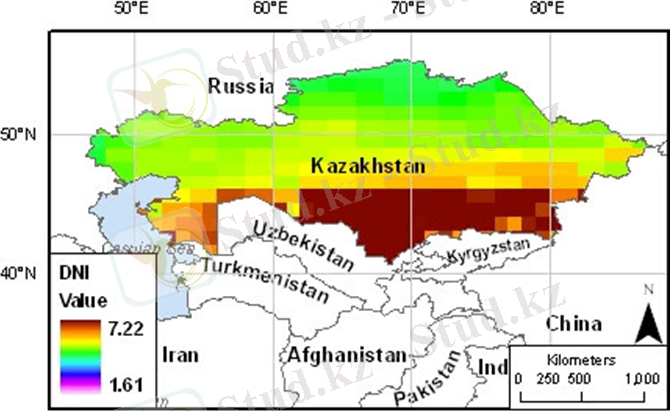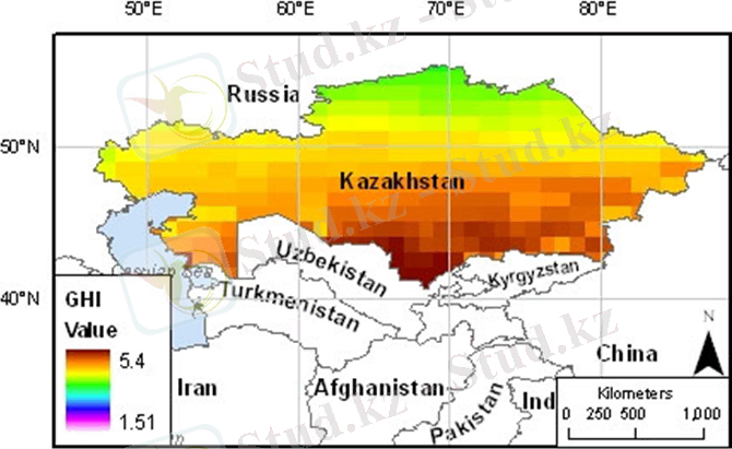 Жарық энергиясының потенциялы Қазақстанда жылына 2, 5 млрд. кВт сағ. аумағында бағаланады. 2. 1 және 2. 2 - суреттерінде Қазақстан Республикасындағы Күн сәулесінің көлемі қөрсетілген.