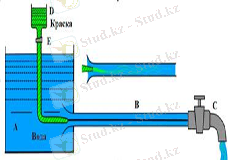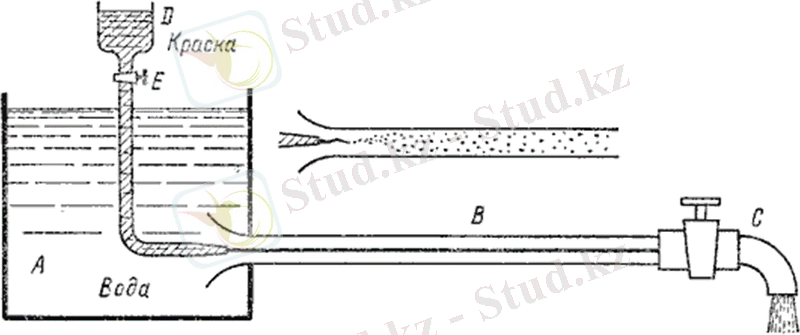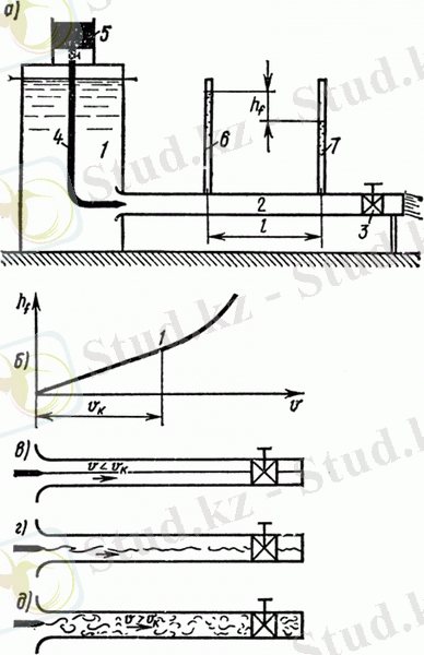 4. Тәжірибе көрсеткендей, төмен жылдамдықта түтіктегі су 3 түсті сұйықтық жұқа ағын түрінде қозғалады оның ішінде сумен араласпай (ламинарлық режим) . Бақыланды су қозғалысының осындай суреті (2. 25, а-сурет) . Берілген тәжірибелік шарттар үшін анықталған жылдамдыққа жеткеннен кейін судың қозғалысы, сұйықтық бөлшектерінің қозғалысы тұрақсыз болады кейіпкер. Түсті сұйықтықтың тамшылары жойылады, бұлыңғыр болады, сондықтан түтіктегі барлық су түсті, турбулентті режим басталады. Су қозғалысының келесі үлгісі байқалады (2. 25, б-сурет) .