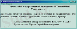 Form6 формасының мәзірі(құрушы туралы ақпарат) Файл мәзірі бөлімінен(ең бастысы мәзірі, слайдты және шығуды шешу) және анықтамадан (әдіс туралы мәзірі) тұрады. "Ең бастысы" батырмасын басқан кезде титулдық нысан ашылады, ал пайдаланылған ақпараттық нысан жабылады, "СЛАУ шешу" батырмасын басқан кезде - жүйенің өлшемін енгізу нысаны.
