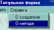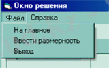 Бұл форманың мәзірі Файл мен Анықтама мәзірінен тұрады. Бөлім Файл бар ішкі мәзірді ең Енгізіп, мөлшері, Шығу. Файл → таңдағанда бастысы титулдық пішін ашылады, ал негізгі пішін жабылады . Файл → өлшемін енгізгенде жүйе өлшемін енгізу пішімі ашылады, ал негізгісі-жабылады . Анықтама бөлімі құрушы туралы, әдіс туралы кіші жүйелерге ие. Пайда алушы туралы анықтама → таңдалған кезде пайда алушы туралы ақпарат көрсетілетін пішін ашылады, Анықтама > әдіс туралы ақпарат көрсетілетін нысан ашылады.
