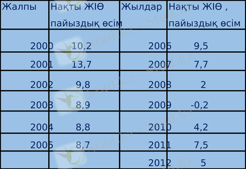 Осы кестеден көріп тұрғанымыздай, 2000 жылдан бастап 2007 жылға дейінгі өсу қарқыны орташа есеппен 9, 7%-ды құрады. Бірақ, 2008-2010 жылдарда әртүрлі қауіпті жағдайлардың себебтерінен өсу қарқыны төмен деңгейге түсті. Дүниежүзін жаулап алған, қаржылық дағдарысқа қарсы бекітілген шаралардың (Бизнестің жол картасы және Индустрияландыру картасы) арқасында 2010 жылдан бастап еліміздің экономикалық өсу деңгейі қайтадан жоғарылап, экономикалық белсенділік арта бастады. Қазақстан Республикасына келетін қаражаттардың көлемі жылдан жылға артып, жеріміз жетекші елдердің қатарына енді.