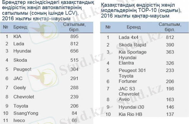 2016 жылдың қаңтар-маусым айларының қорытындылары бойынша жергілікті құрастырылымдағы жеңіл автокөліктер сегментінде бестселлердің бестігін Kia (895 бірл. ), Lada (812 бірл. ), Hyundai (656 бірл. ), Skoda (515 бірл. ) және Peugeot (304 бірл. ) құрады. Қазақстандық сатып алушылар Jac (291 бірл. ), Geely (288 бірл. ), Chevrolet (239 бірл. ), Toyota (206 бірл. ), SsangYong (84 бірл. ) және Iveco (66 бірл. ) сияқты отанымызда құрастырылған маркаларға да өз таңдауын жасады.