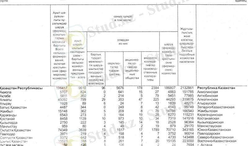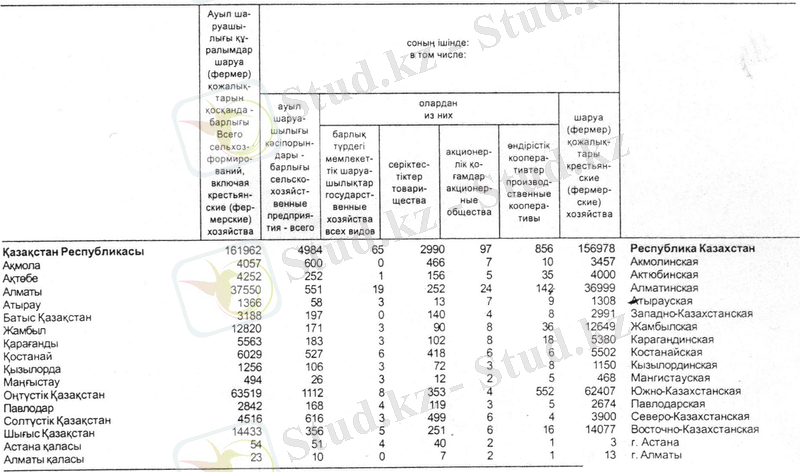 Облыстық статистика басқармасының шаруа қожалықтарының қызметі туралы мәліметтерінде, облыс бойынша 2005 жылы қаңтар айының 1 жұлдызында 67, 1 оның 60, 1 мыңы, яғни 89, 6% белсенді шаруашылықтар қатарына жатады.