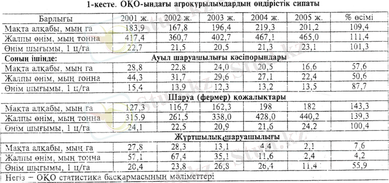 Осы кестеде көрсетілгендей, мақта шаруашылығымен айналысатын ірі ауыл шаруашылығы кәсіпорындарының егістік жер көлемі кему үрдісі байқалады. Олардағы егістік 2001 жылы 28, 8 мың га болса, 2006 жылы 16, 6 мың гктарға дейін азайған, сөйтіп тиісінше 84, 7% құраған. Яғни, ірі кәсіпорындардан шаруа қожалықтарының бөлініп шығу үрдісі аяқталмаған. Ірі ауыл шаруашылық кәсіпорындарданшаруа қожалықтарының бөлініп шығу үрдісі аяқталмаған. Ірі ауыл шаруашылық кәсәпорындарында тұрақты шаруашылық-экономикалық жағдайы қалыптаспаған. Сондықтан олардың экономикалық-қаржылық жағдайы айнымалы, жалпы өнімнің төмендеуі орын алған.