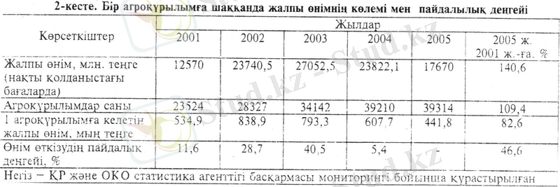 Оңтүстік Қазақстан облысы бойынша мақта саласындағы бір агроқұрылымдықның орташа жалпы өнімі 2-кестеде көрсетілген. Оның көлемі және пайдалық деңгейінің төмендеуі байқалады.