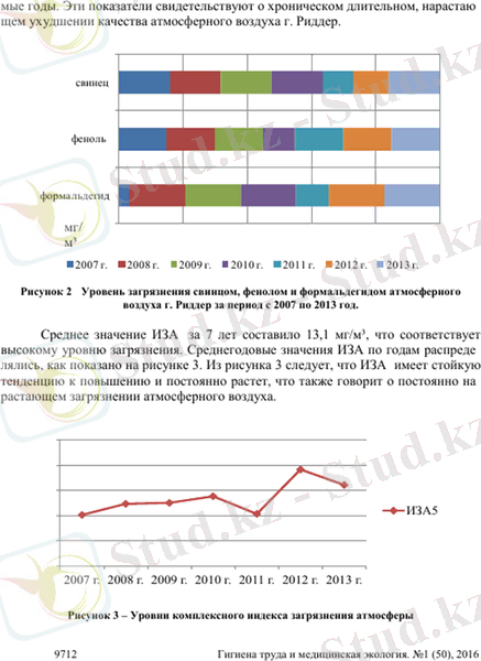 3 - сурет бойынша, зерттелген барлық жылдарда қорғасын концентрациясы ШРК асып тұрды. Әсірісі, 2011 және 2012 жылдары ол 0, 0006 мг/м3 және 0, 0007 мг/м3 тең болды. Сонымен қатар, формальдегид пен фенолдың концентрациясы да жоғары болды, Осы нәтижелер Риддер қаласының ауасының ұзақ уақыт бойы бірқалыпты ластануын дәлелдейді.