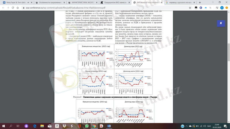 - 2015 жыл бойынша, ластану деңгейі жоғары. Стандартты индекс - 0, 96 құрады ( күкірт диоксиді бойынша) . ШРК мәнінен асқан жағдайлар саны күкірт диоксиді - 64 және азот диоксиді - 53 рет ( 2 кесте ) .