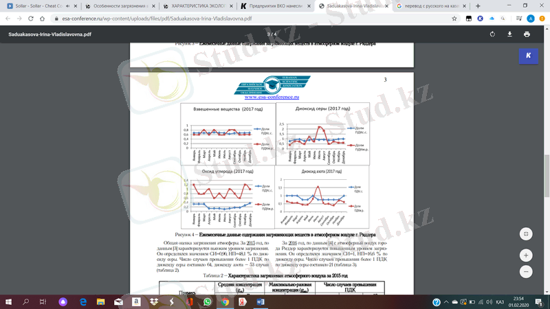 - 2017 жыл бойынша, ластану деңгейі жоғары. Стандартты индекс - 0, 87құрады ( күкірт диоксиді бойынша) . ШРК мәнінен асқан жағдайлар саны күкірт диоксиді - 72, көміртек оксиді - 2, азот диоксиді - 3 рет ( 4 кесте) .