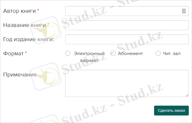 Сонымен қатар оқырман веб-сайтта тіркелген болса, оған түрлі қосымша мүмкіндіктер ашылады, солардың бірі - онлайн тапсырыс беру. Онлайн тапсырыс 3-суретте көрсетілген форма арқылы жүзеге асырылады. Оқырманның онлайн-тапсырыс арқылы келген материалы оны цифрлық түрге келтіретін «Элар» сканері арқылы жүзеге асырылады. Одан кейін материалдың толық библиографиялық сипаттамасы арнайы парсер арқылы Ирбис жүйесінен алынып, elib. kaznu. kz электрондық кітапханасына жүктеледі. Тапсырыс толықтай орындалғаннан кейін оқырманның электрондық поштасына тапсырыстың дайын екендігі жайлы хабарландыру жіберіледі.