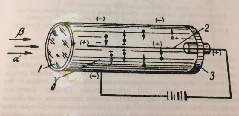 Егер камераға радиоактивтілік кҿзін жақындатса, онда одан бөлінген сәуле, яғни детектордың камерасына кірген зарядталған альфа- жҽне бета- бөлшектер оның ішіндегі газ ортасында тікелей бірінші реттік иондау түзеді; гамма кванттары детектордың қабырғасында алдымен жылдам электрондар (фотоэлектрондар, комптонэлектрондары электрон позитрон жұптарын) түзеді де, сонан соң олар детектордағы газ ортасының иондалуын туындатады.