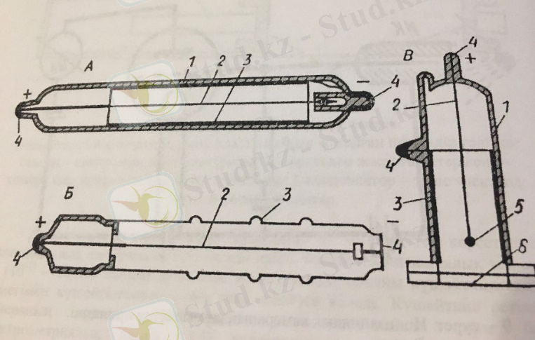 1-шыныдан жасалған баллон; 2-анод; 3-катод; 4-тоқ көзіне қосатын тетігі; 5-шыныдан жасалған шарик; 6-слюдадан жасалған жұқа терезе.