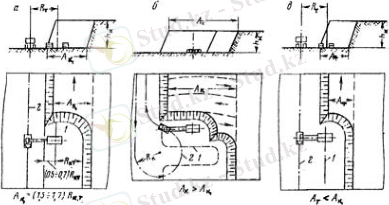 Сурет 3. 1- Механикалық күректердiң, қарапайым (а), кең (ə) жəне тар тiлмелерi: 1 - экскаватордың жүру өсі; 2 - көлік құралдарының жүру өсі.
