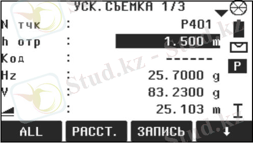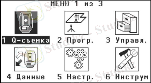 Тахеометрді орнатқаннан кейіґн бірден жұмысқа кіріґсуге болады. Оглы үшін Кіру - Главгное меню терезесінен Q-түсіру мәзіґрін ашыңыз.