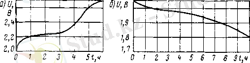 Тұрақты токпен зарядталған кезде қорғасын аккумуляторының кернеуінің өзгеру қисығы суретте көрсетілген. 213, а. зарядтың бірінші кезеңінде белсенді массалардың беткі қабаттары қалпына келтірілгенде, батареяның кернеуі тез артады (2, 12 в дейін), содан кейін баяу (2, 3 в дейін) .