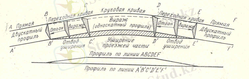 Кіші радиустарда қосымша өту бөлігі болады, қисық ауысымының шекті бөлігіне негізделеді. Вираждың негізгі элементтері болып табылады: