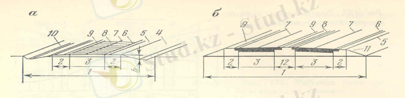 Жолдың бойлық қиманың элементі: а-бір өтетін жолмен; б-екі өтетін жолмен және бөлінетін жолақпен.
