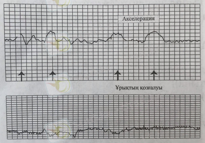 СЕТ ареактивті: 40 мин бойы ұрықтың жүрек соғысының екі ретке дейін жиілеуі, 15 соққы/ минутына кем болуы және ұзақтығы 15сек аз болуы.