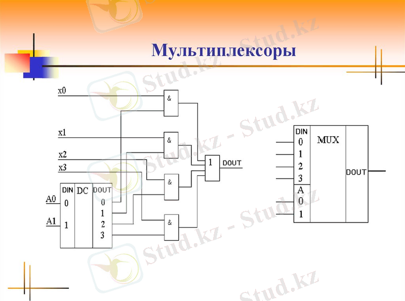 Мультиплексорлар MUX (ағылшынның multiplexor деген сөзінен шыққан) немесе MS (multiplexor selector) белгілерімен белгіленеді. Жұмысқа рұқсат беруші Е кірісі мультиплексордың функционалды мүмкіндіктерін кеңейту үшін де қолданылады, мысалы, мультиплексордың ақпараттық кірістерінің санын көбейту (кіріс сөзінің разрядттылығын өсіру) үшін және оның жұмысын басқа құрылғылар жұмысымен синхрондау үшін керек. Мультиплексор универсалды құрылғы болып табылады, оның негізінде түрлі комбинациялық және тізбекті сұлбалар жасалынады. Мультиплексорлар параллельді коданы тізбекті кодаға түрлендіруге арналған сигналдардың коммутатор-селекторы ретінде жиі қоданылады. Сонымен қатар, мультиплексор екілік сандарды разрядтар бойынша жылжуын қамтамасыз ететін комбинациялық жылжыту құрылғысы ретінде де қолданылады. Мультиплексорлар, мысалы, МП І8088 құрылғыда адресы мен мəліметтерді бірдей шығыстарына беру үшін пайдаланылады. Бұл микросұлбалардың шығыстарының жалпы санын азайтуға мүмкіншілік береді. Басқарудың микропроцессорлық жүйелерінде алшақтық объектілерінде орнатылған бергіштерден (датчиктерден) ақпаратты бір байланыс сызығы бойымен беруі үшін де мультиплексорларды пайдаланады. Екі арналы мультиплексор НЕМЕСЕ, ЕМЕС жəне екі ЖƏНЕ бөлшектен тұрады (1 сурет) . Екі арналынған мультиплексорды логикалық түрлендіргіштің көмегімен модельдеу нəтижесінде оның шығыс сигналы келесі өрнекпен бейнеленіледі: OUT = BC`+AC. Яғни адрес бар кіріс С =0 болған жағдайда, сигнал В арнадан шығысына кетеді, ал С =1 боған жағдайда, сигнал А арнадан шығады. Бұл мультиплексор жұмысынығ логикасына сəйкес келеді. Мультиплексорлар бірнеше кіріс шиналардан бір шығыс шинаға түсетін сигналдарды берілген ретімен коммутациялау үшін пайдаланылады. Мультиплексордың, мысалы, 16 кірістер 3 мен 1 шығысы болуы мүмкін. Бұның мағынасы мынада: егер бұл кірістерге цифрлық сигналдардың 16 қайнар көздерін, яғни ретімен келетін цифрлық сӛздердің генераторларын қоссақ, онда кез келген генераторлардың байттарын жалғыз бір шығысына беруіне болады. 16 арналардың ішінен кез келген арна үшін селекцияның 4 кірісі (24=16) болуы тиіс, бұл кірістерге арнаның екілік адрес беріледі. Мысалы, мəліметтерді арнадан беруі үшін селекцияның кірістерінде 1001 кодын орнатуы керек. Осыған байланысты, мультиплексорларды деп жиі атайды.