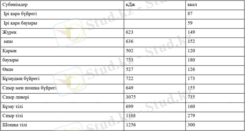 Әртүрлі мал субөнімдерінің тағамдық құндылығы; кДж, ккал