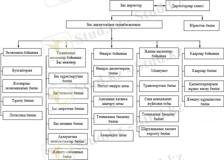 Компания жұмысын бас директор басқарады. Бас директор мекеменің өндірістік-шаруашылық, қаржылық-экономикалық қызметін басқарады, барлық құрылымдық бөлімшелердің, цехтардың, өндірістік бірліктердің өз ара іс- қимыл нәтижелерін ұйымдастырады. Олардың жұмыстарын өндірісті дамытуға және жетілдіруге бағыттайды.