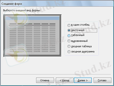- Автоформа (баған бойынша, ленталық, кестелік, қиылысқан (сводная) кесте, қиылысқан диаграмма)