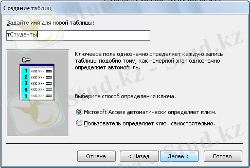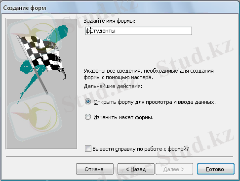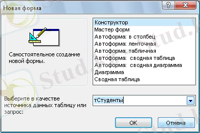 - Форма шебері арқылы тСТУДЕНТЫ кестесіне форма құрайық. Ол үшін ашылған терезеден форма шеберін және кесте атын таңдаймыз. ОК батырмасын басамыз.