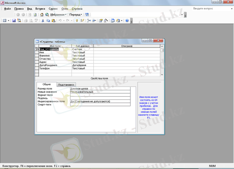 Әрбір мәліметтер типі конструктор терезесінің «Өріс касиетгері» бөлімінде бейнеленетін өз қасиеттерімен үлестіріледі.
