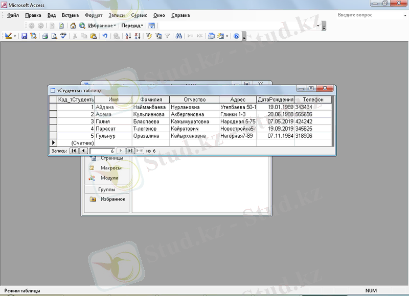 Зертханалық құрған тСтуденты кестесіне сұраныстар құру. Конструктор көмегімен аты «А» әрпінен басталатын студенттер тізімін шығару, Фамилия өрісін кему реті бойынша, Дата рождения өрісін өсу реті бойынша, Телефон өрісін өзгеріссіз шығару.